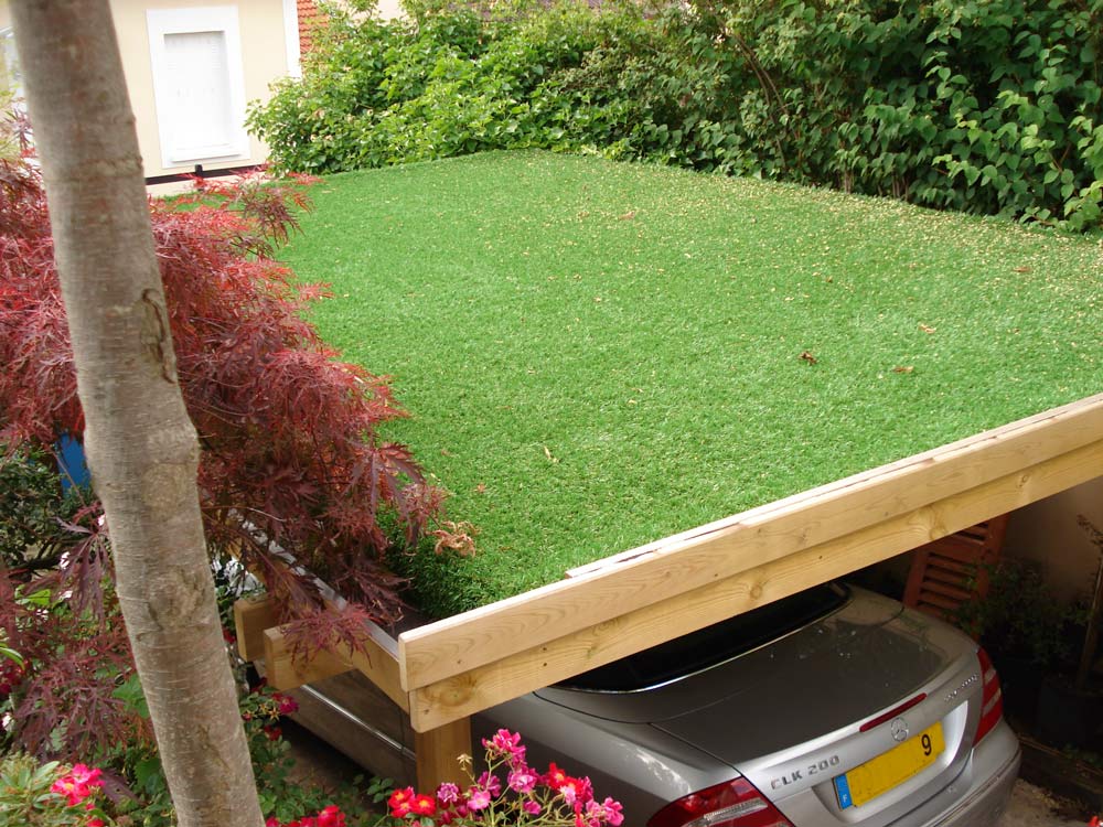 La photo vous donne l'aspect du gazon synthetique Athéna sur cette structure de bois faite pour être une protection de voiture . Cette grande structure est complètement intrégrée et discrète dans un environnement très fleuri. |